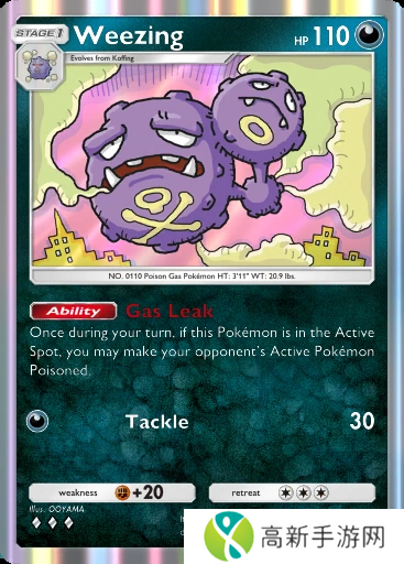 双弹瓦斯:特性能让对方前场宝可梦中毒,每个回合结束掉10血,自身可以作为任何卡组的肉盾使用。控制卡组的可选过渡组件。