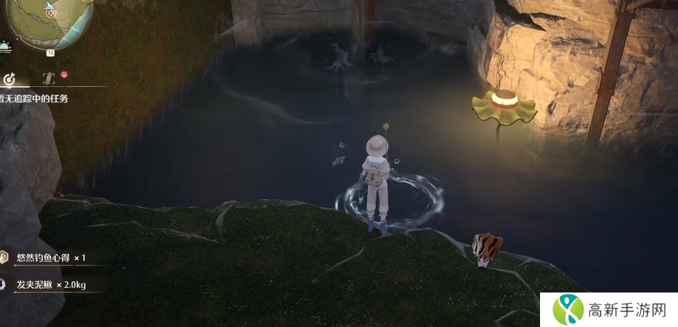 传送到福鸣之井,然后一直向外走,来到上面的瀑布处,进入洞口,跳下平台来到钓点。