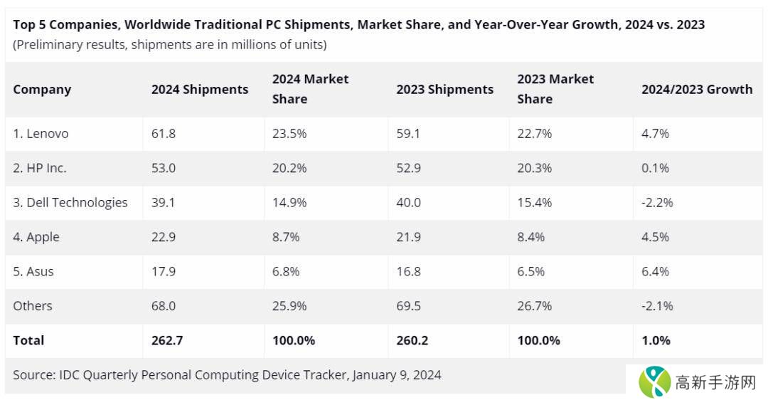 在品牌竞争格局方面,IDC的报告同样提供了详尽的分析。展望2024年全年,联想、惠普、戴尔、苹果和华硕这五大品牌将继续领跑全球PC市场。值得注意的是,尽管市场整体增长有限,但除了戴尔出货量同比下降2.2%外,其余四大品牌均实现了正增长,展现了它们在复杂市场环境下的强劲竞争力和适应能力。