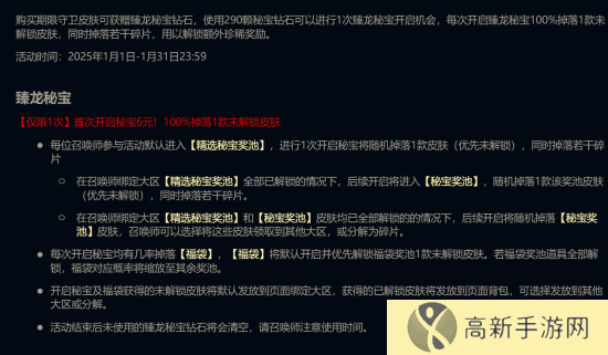 此外,在皮肤抽奖活动“臻龙秘宝”中,官方还为所有账号等级15以上的召唤师免费赠送一次抽奖机会。每次抽奖100%掉落一款未解锁皮肤,活动时间截止至1月31日23:59!活动地址>>>