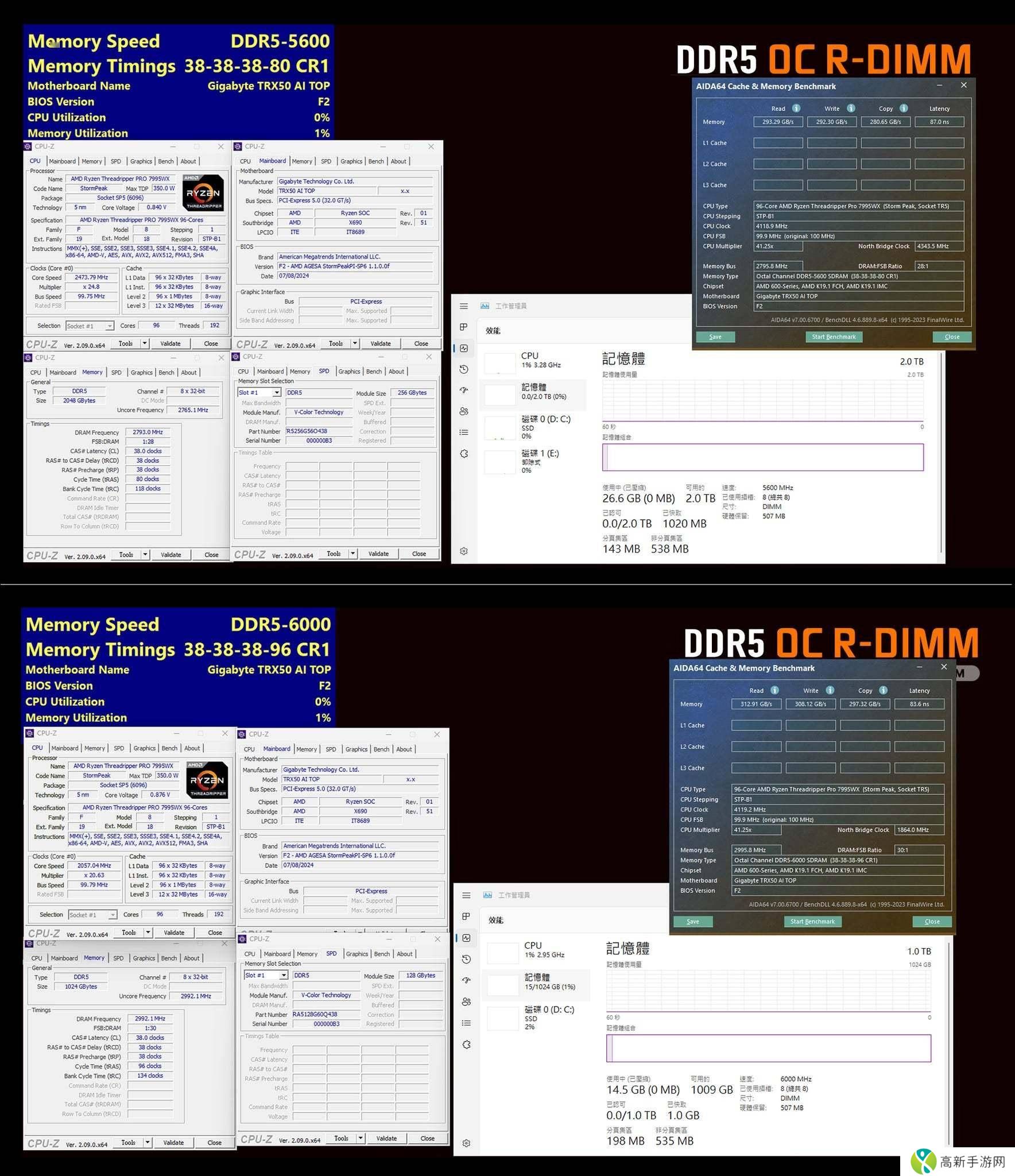 为了验证这批内存条的稳定性和性能,全何已将其在技嘉AI TOP系列主板上进行了全面的测试。测试结果显示,在英特尔平台(技嘉W790 AI TOP)上,8×256GB和4×256GB的组合均能达到5600MT/s的传输速率,时序为CL38。而在AMD平台(技嘉TRX50 AI TOP)上,8×256GB的组合同样能达到5600MT/s CL38,4×128GB的组合则能更进一步,达到6000MT/s CL38。