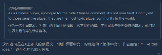 此外还有玩家扒出作者曾在X上欣然接受网友给他出的“馊主意”——如果他们想要中文,那你就给他们做个繁中。作者回复“我喜欢这个主意”,更是与他道歉贴中所提及的“我不是种族主义者”相矛盾。