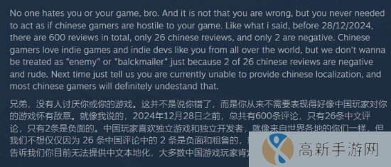 玩家指出他此前的发泄怒喷与道歉并不能做到自洽,玩家翻出该作此前600条游戏评价中,只有26条中文评价,而这其中只有两条是负面的就要被挂出来喷,明显是有所针对。