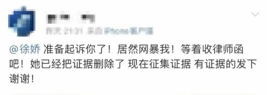 对此,该网友认为徐娇的行为构成网络暴力,正在收集证据准备起诉她。