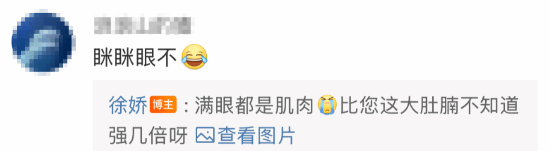 该条微博的评论区下方有网友询问:“眯眯眼不?”徐娇则回复:“满眼都是肌肉,比您这大肚腩不知道强几倍呀”,并配上了该网友的生活私照。