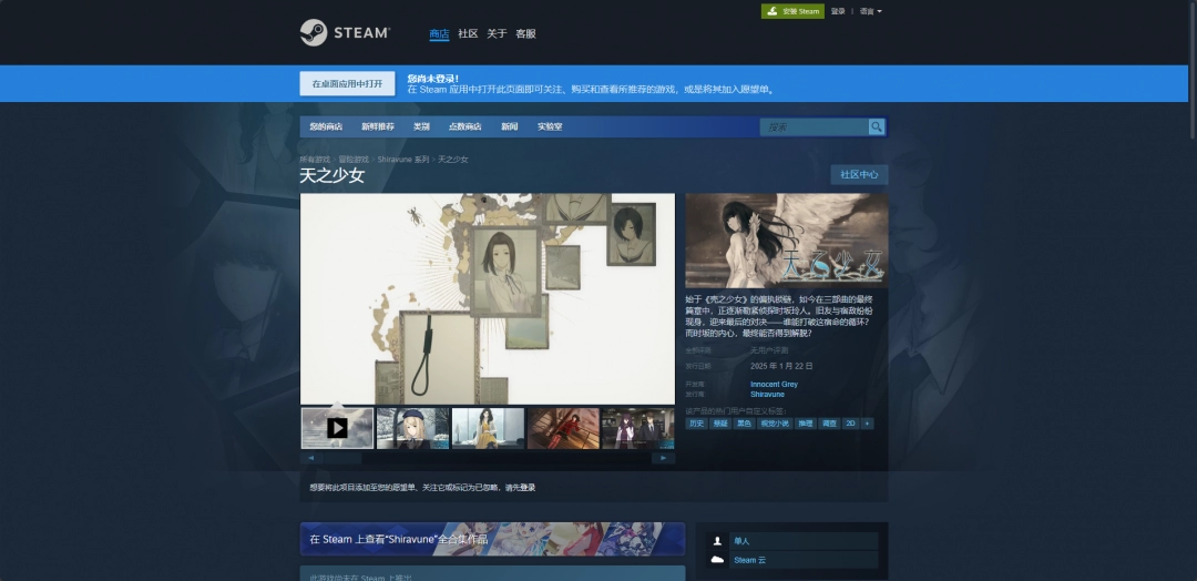 《天之少女》是一款非常有趣的悬疑冒险游戏,而这款游戏的官网地址就是Steam平台的购买页面,进入到这个游戏的购买页面基本上就能知道所有这款游戏的信息。