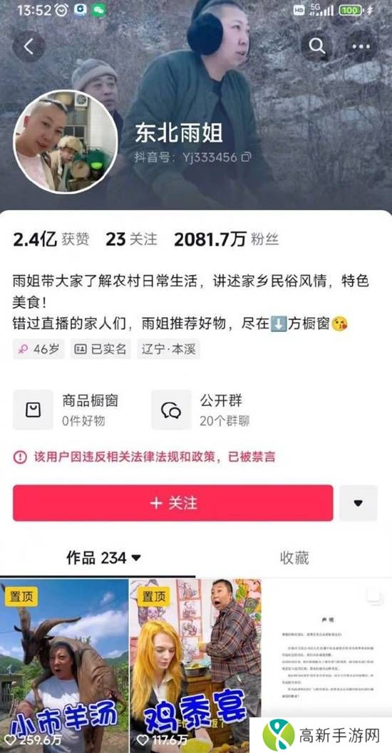 10月14日,央视新闻揭秘“东北雨姐”直播背后的真相,称其在是“表演农村生活而非记录农村生活”,揭露了该团队租房建基地,按剧本拍摄造假。12月12日,“东北雨姐”在抖音账号仍未解封,系统用红字特别提示,“该用户因违反相关法律法规和政策,已被禁言”。还有社交平台显示,“该用户因违反社区规定被禁止关注”。