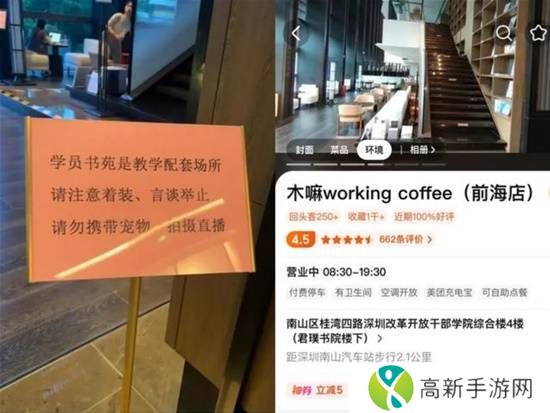 根据消费者发布的图片,门店现场竖立着告示牌提示“严禁直播、摄影、商业活动等”“学员书苑是教学配套场所,请注意着装、言谈举止”等,而在线上平台,木嘛咖啡(前海店)没有标注对着装等有要求。