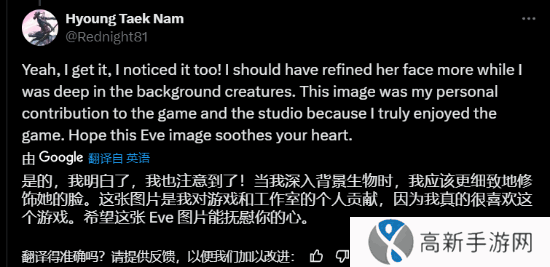 他向网友们表达了歉意,并表示自己太注重绘制背景被伊芙爆杀的敌人,却忽略了应该更细致地修饰她的五官:“这张图片是我个人对游戏和工作室的礼物,因为我真的很喜欢这个游戏。希望这张新的伊芙插画能抚慰你的心。”