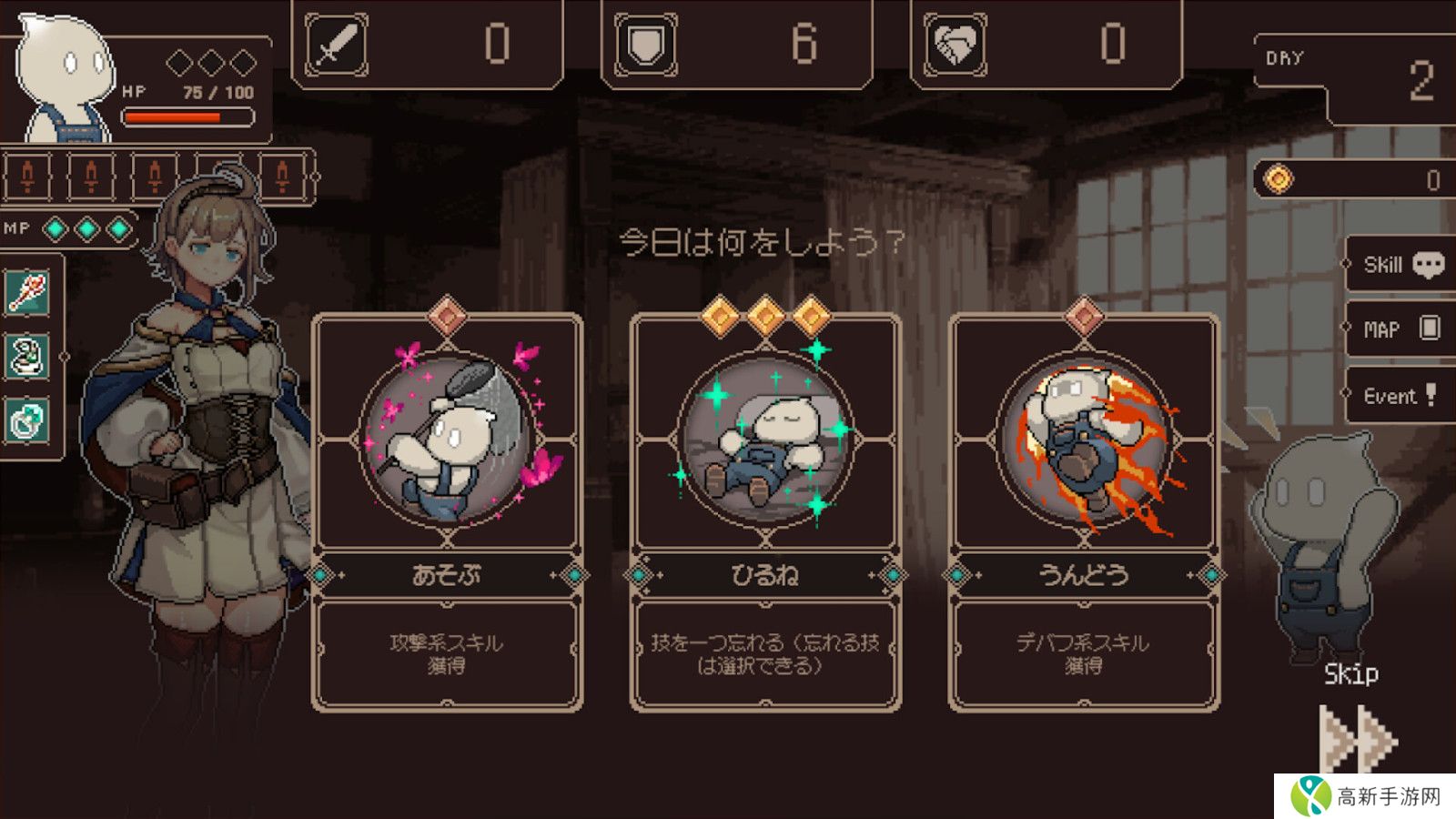 玩家每天可以选择六种活动来提升能力、学习技能、赚取金钱,同时还要面对敌人。他们还可以开发武器装备,休息恢复体力。