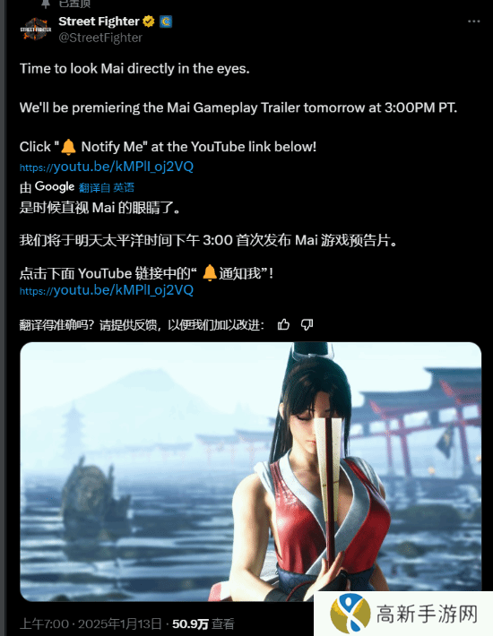 而就在今天,《街霸》官推发文宣布,不知火舞最新预告片将于北京时间1月14日早上7点正式公布!“是时候直视舞的眼睛了!”