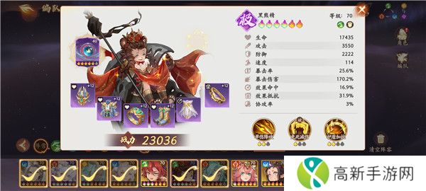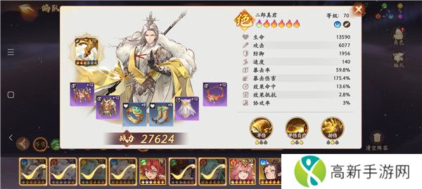 4、杨戬:一彩就行,出手位第三或第四,法宝带专属或者猴子专属,天赋追求全输出就暴击爆伤攻击均衡加点,适当点生命和防御。