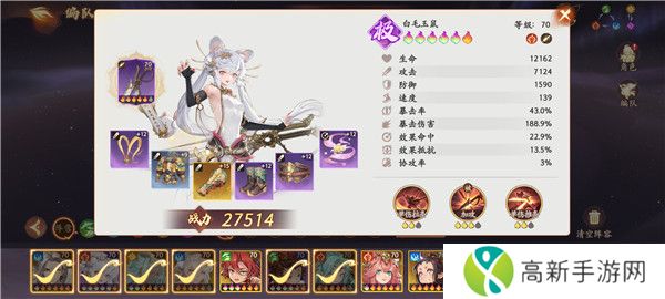 3、白毛玉鼠:单点爆发输出,用来过前排和打boss; 刚需三彩(五彩最佳),前期抽卡很容易抽出。天赋主点攻击,副点攻击爆伤,速度需调整至第三或第四出手。法宝:裁云。