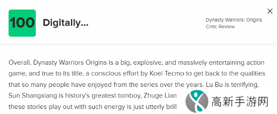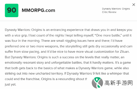 MMORPG.COM同样给出了90分高分,认为《真三国无双:起源》能带给玩家们“一种令人着迷的体验”,让人无法自拔。“数不清有多少个夜晚,我一直告诉自己‘再玩一会!’直到凌晨四点。”