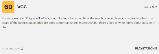 而VGC则给出了最低的60分评价,认为《真三国无双:起源》虽然能为粉丝们提供足够的内容,但并不会让新玩家和系列老粉感到大吃一惊。游戏的战斗规模确实让人印象认可,但除此之外实在是没什么值得大书特书的东西了。