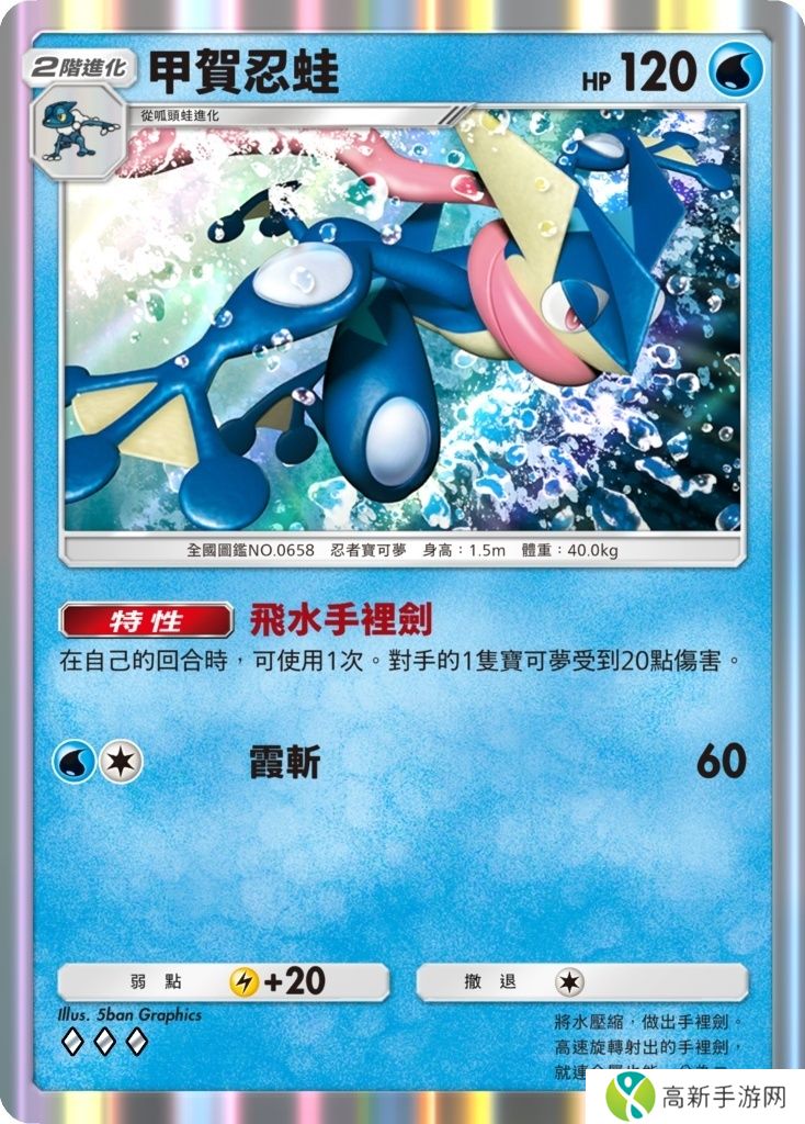 卡牌中的甲贺忍蛙在水中威风前进的样子,实在令人着迷。这张插画在2013年于《宝可梦集换式卡牌游戏》中公开,卡牌的特性及招式则和当时有所不同。玩家可以与被描绘得栩栩如生的宝可梦们来场令人怀念的重逢,也能够享受崭新的邂逅。