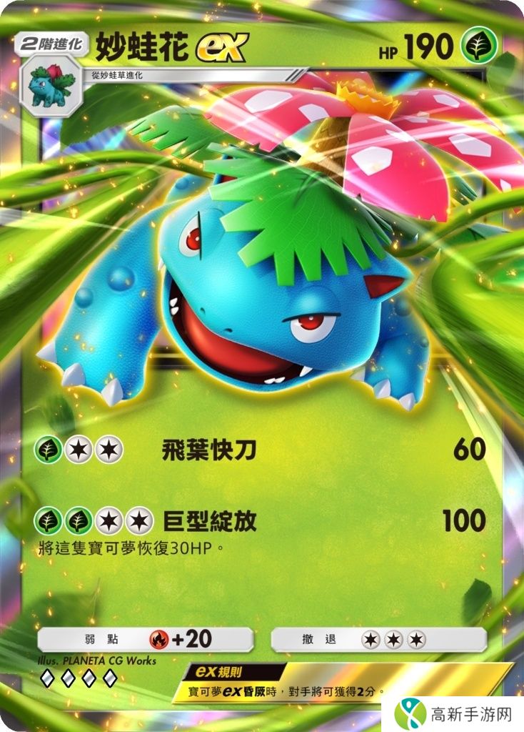 这张卡牌是插画在本作首次公开的妙蛙花ex。上头描绘了它伸出藤蔓投入对战的身姿。部分宝可梦ex的插画可透过变换角度,欣赏到插画生动逼真的视觉表现。