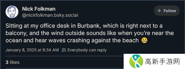 《漫威蜘蛛侠》开发商 Insomniac Games 总部也距离另一处的伊顿火灾不远。工作室编剧 Nick Folkman 在社交媒体上写道:“坐在我位于伯班克的办公桌旁,外面的风声听起来就像你在海边时听到的海浪拍击海滩的声音。”