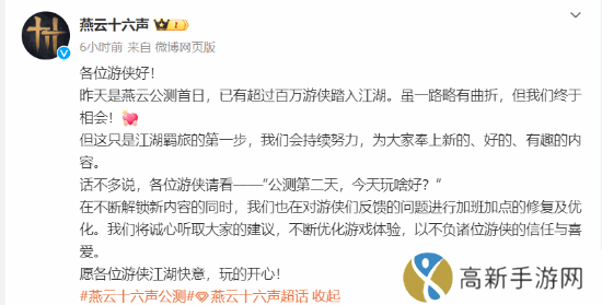 网易旗下国产武侠动作游戏《燕云十六声》PC版公测已于昨日(2024年12月28日)正式开启。今日游戏官方在微博宣布,已有超过百万名游侠踏入江湖!“虽一路略有曲折,但我们终于相会!”