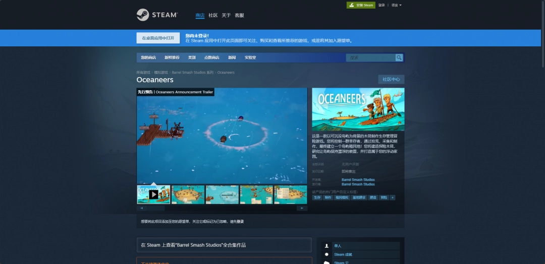 《Oceaneers》是一款以可沉没岛屿为背景的木筏制作生存管理冒险游戏,而这款游戏的登录平台目前只有Steam平台,想要玩只需要在这个平台购买下载就可以了。暂未登录EPIC平台和PS平台,主机玩家们还需等待。