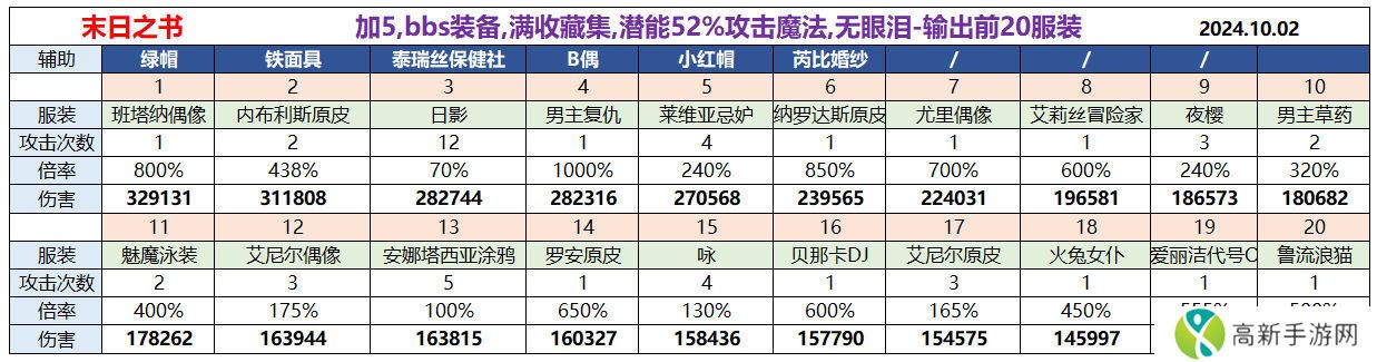 如果这些服装都没有或者未加5,请使用下文的 末日之书计算器,自动计算输出前20服装。