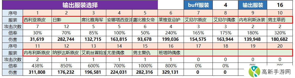 3.自buff技能只影响当前技能的伤害,也就是说每个衣服等于一个独立的人!同一个角色多个衣服的多个自buff不能角色共享(男主、西利亚之类的)。