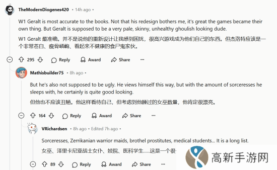 杰洛特的形象变化也引起了讨论,有网友则从原著角度评价了杰洛特的形象:“《巫师1》的杰洛特形象最符合原著。我并不是说他的新形象让我不满,游戏能形成自己的风格很棒。但杰洛特应该是一个非常苍白、瘦弱、看起来像食尸鬼的家伙。”