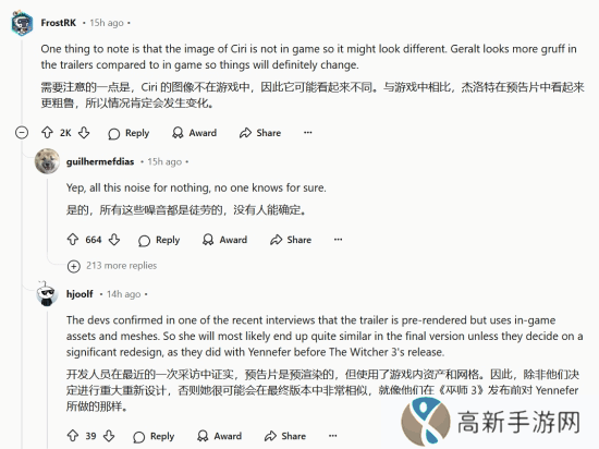 另一位网友则补充了开发者的相关信息:“开发人员在最近的一次采访中证实,预告片是预渲染的,但使用了游戏内的素材和模型。因此,除非他们像《巫师3》发布前对叶奈法进行重大重新设计那样,否则她最终的样子很可能与预告片非常相似。”