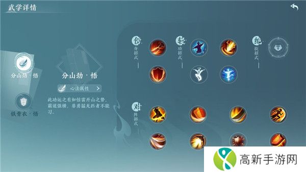 苍云分山劲:外功近战,擎刀姿态对敌人进行连续追击,盾墙姿态下,具有不错的防御力, 擎盾姿态下,则具有均衡的综合能力。