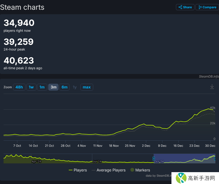 根据 SteamDB,12 月 30 日游戏的同时在线玩家人数超过了 4万人,此前的纪录为游戏发售后一个月时达到了 3.79 万人。游戏于 11 月初就开始获得热度,并且目前已经数天热度居高不下。