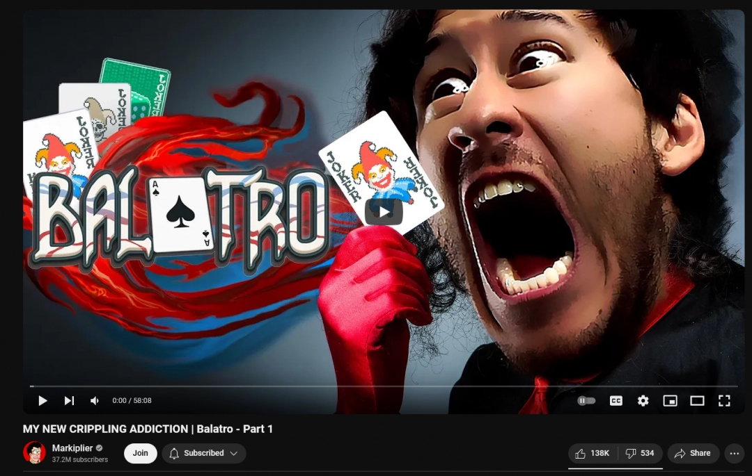 此外,拥有 3 千万粉丝的老牌热门游戏视频制作者 Markiplier 在 12 月 23 日上传了一个《小丑牌》的视频,至今该视频已经获得了 290 万次观看,以及 13.8 万点赞。海外的圣诞-新年长假也让更多的玩家有时间能够投入在游戏上,导致了游戏游玩人数整体上升。