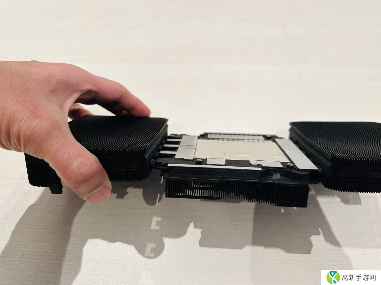 两块铝制散热鳍片通过热管紧密相连,而第三块散热鳍片则巧妙地位于均热板下方。两只轴流风扇分别位于两侧散热鳍片的下方,它们不断旋转,带动空气流经散热鳍片,将热量带走。这一设计不仅提高了散热效率,还使得显卡的整体结构更加紧凑和美观。