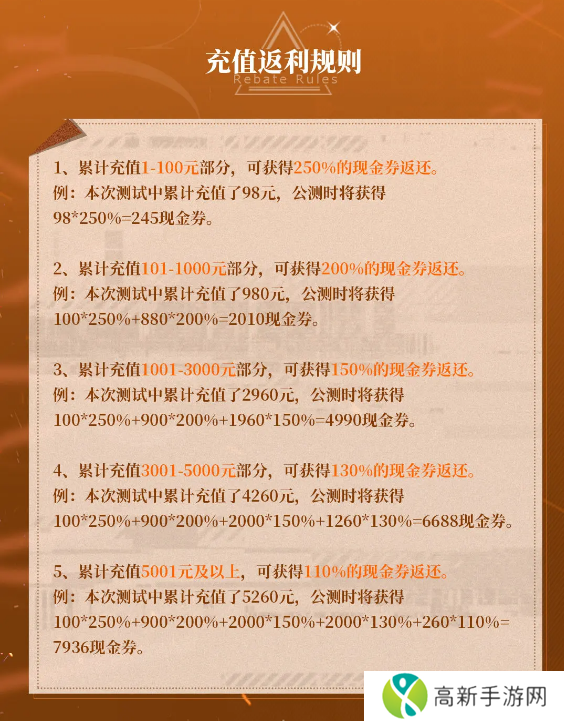 本次测试为删档付费测试,专员们在本次测试中充值的金额将在正式上线后以「现金券」的形式阶梯式返还,最高可获得250%现金券!