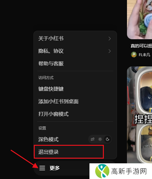 答:小红书网页版的退出和登录按键在网页左下角的【更多】,点击更多可看到【退出登录】,登录同理,如下图。