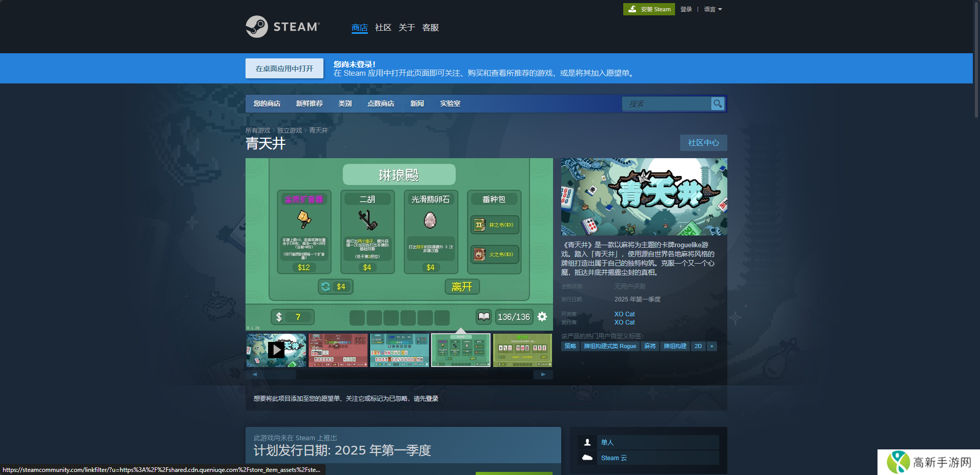 《青天井》是一款以卡牌roguelike游戏,而这款游戏的下载网址就是购买平台的购买页面,比如Steam版就是在购买页面购买之后,点击页面中的马上开玩就可以开始下载了。