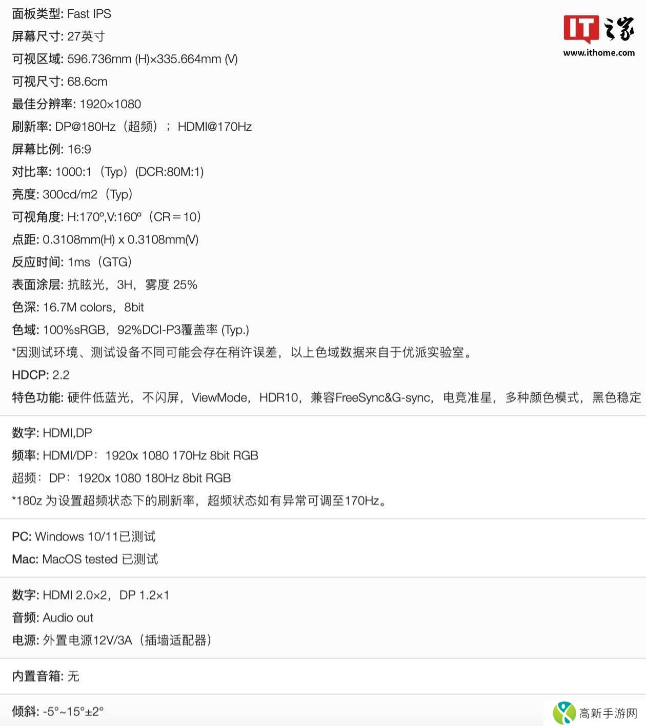 在显示性能方面,VX2757-HD-PRO配备了Fast IPS面板,分辨率达到1920x1080,刷新率高达180Hz,确保了画面的流畅与细腻。其亮度达到300尼特,GTG响应速度仅为1ms,为用户带来更加真实的色彩与动态画面表现。静态对比度为1000:1,支持8-Bit色彩,色域覆盖方面,该显示器达到了100% sRGB及92% DCI-P3,能够满足大多数用户的色彩需求。