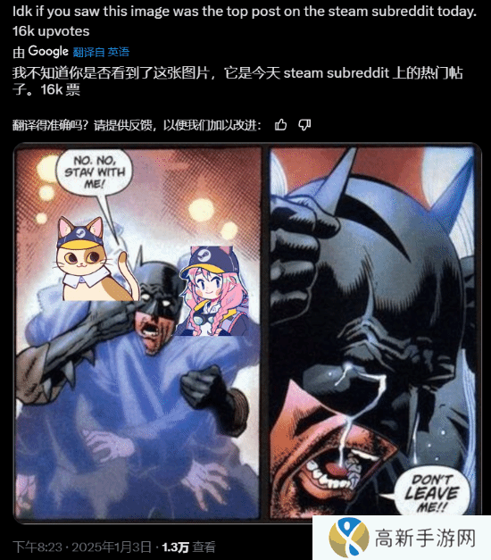对此有玩家将蝙蝠侠经典梗图进行修改,央求Steam看板娘不要离开。据悉,该昨日在Steam社区获得了高达1万6千赞。