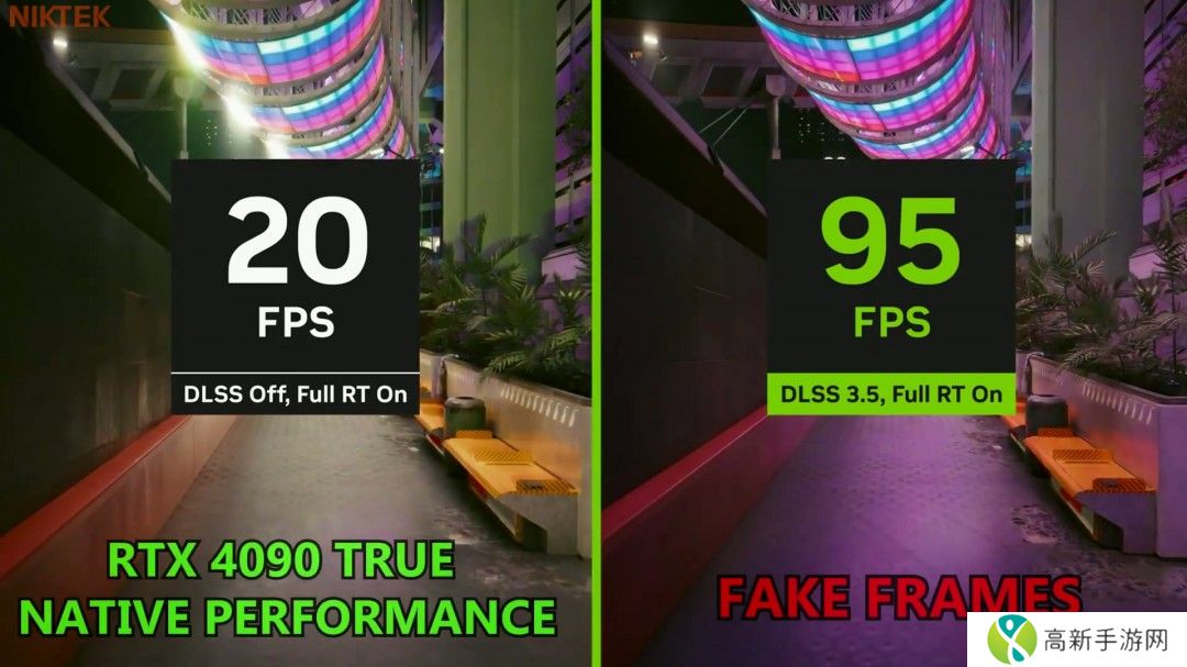 随后如果翻到英伟达展示DLSS 3的视频,可以看到RTX 4090在同样设置下,原始帧数为20FPS,而开启DLSS 3后,来到了94FPS。这意味着在《赛博朋克2077》这款游戏上,RTX 5090的原始性能仅仅比RTX 4090提升了8帧?!