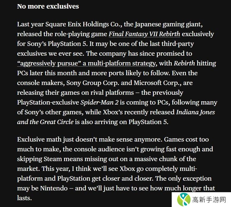 Schreier说:“2025年我们将看到微软全面向多平台发展,而索尼也将逐渐减少独占作品。任天堂在短期内并不会效仿此举措,但这种策略可能不会持续太久,随着开发成本的增加,任天堂可能不得不重新评估其策略。”