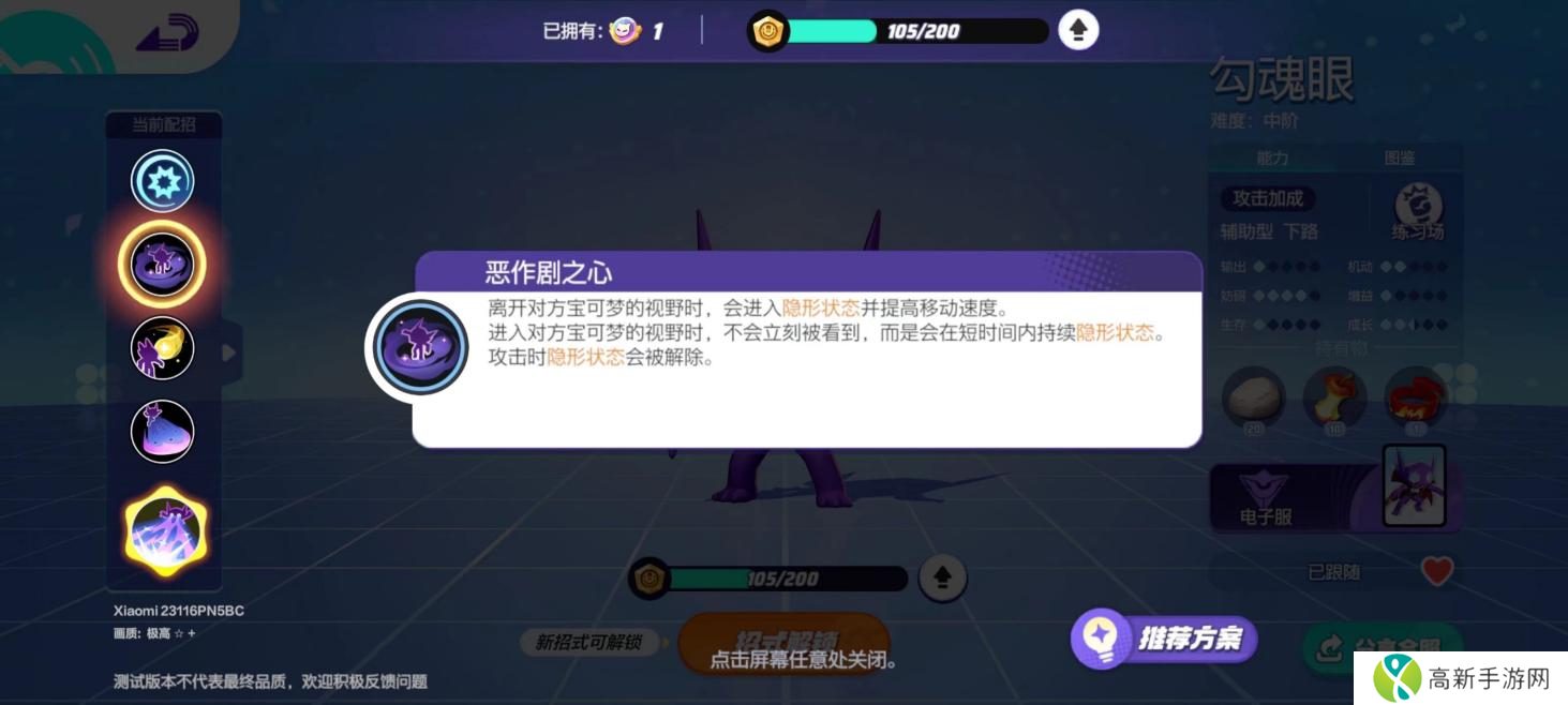 被动:“恶作剧之心”【离开对方宝可梦的视野时,会进入隐形状态并提高移动速度。进入对方宝可梦的视野时,不会立刻被看到,而是会在短时间内持续隐形状态。攻击时隐形状态会被解除。】