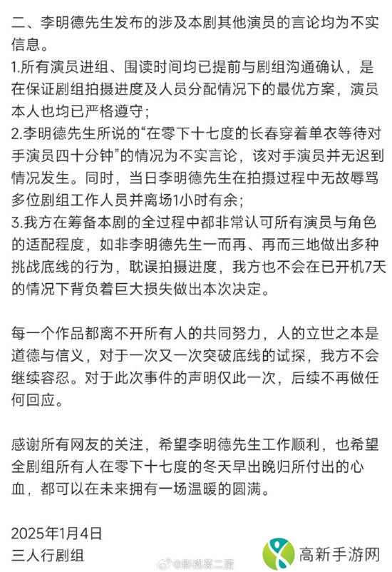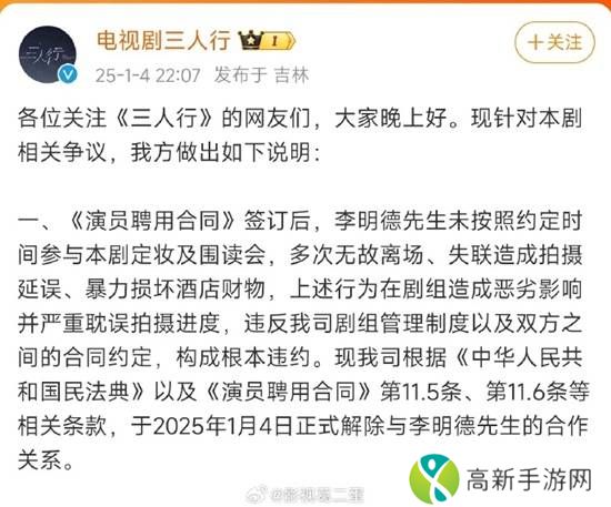 声明中还称,《演员聘用合同》签订后,李明德未按照约定时间参与本剧定妆及围读会,多次无故离场、失联造成拍摄延误、暴力损坏酒店财物,上述行为在剧组造成恶劣影响并严重耽误拍摄进度,违反剧组管理制度以及双方之间的合同约定,构成根本违约。已于2025年1月4日正式解除与李明德的合作关系。