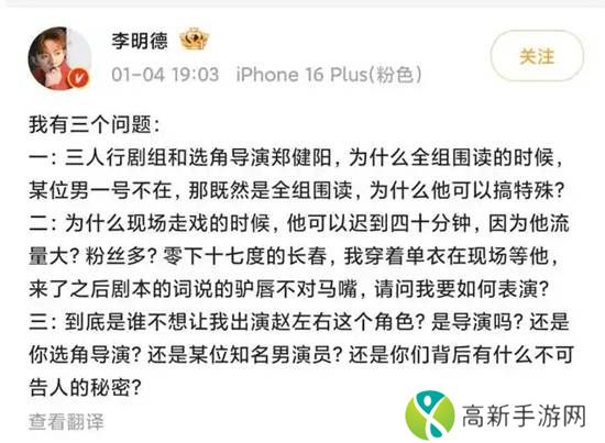 李明德在微博质问,“为什么现场走戏的时候,他可以迟到四十分钟,因为他流量大?粉丝多?零下十七度的长春,我穿着单衣在现场等他,来了之后剧本的词说的驴唇不对马嘴,请问我要如何表演?”他还提到,有人不想让他出演剧中赵左右这个角色。