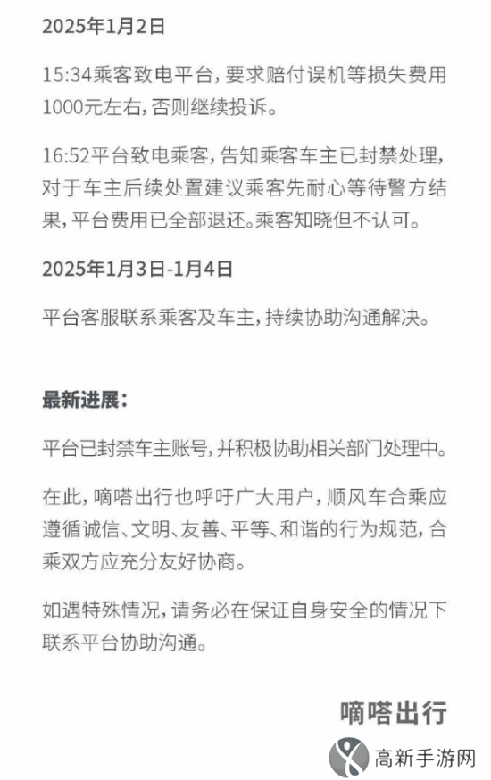 此外,嘀嗒出行官方也呼吁广大用户,顺风车合乘应遵循诚信、文明、友善、平等、和谐的行为规范,合乘双方应充分友好协商。如遇特殊情况,请务必在保证自身安全的情况下联系平台协助沟通。