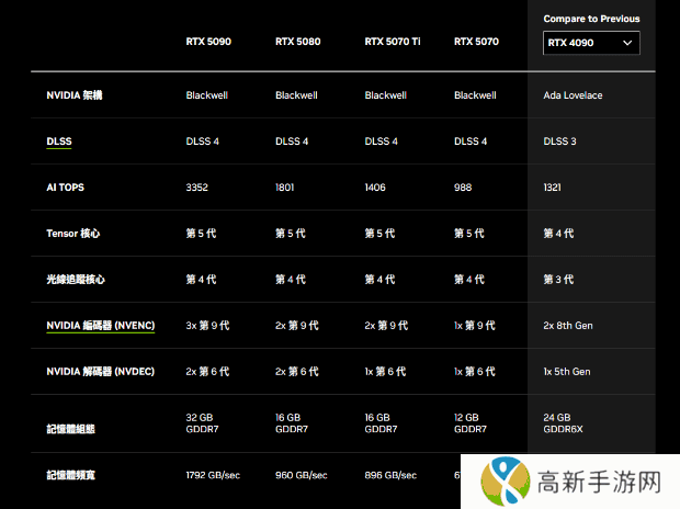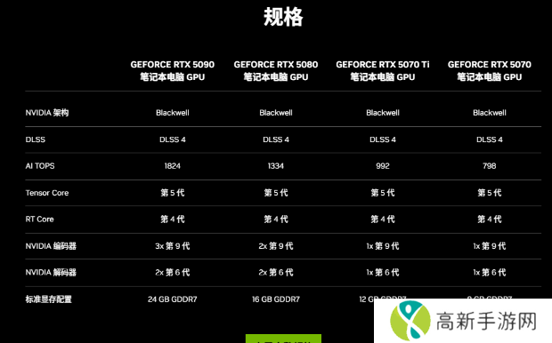 本次发布的笔记本电脑GPU包括RTX 5090、RTX 5080、RTX 5070 Ti、RTX 5070,他们与RTX 50系列桌面显卡一样基于Blackwell架构,都有第四代RT核心、第五代Tensor核心、DLSS 4。