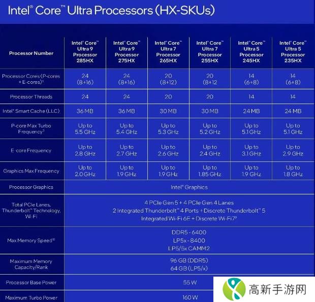 面向高端游戏本的Intel酷睿Ultra 200HX系列共有六款型号,旗舰型号为酷睿Ultra 9 285HX,24(8+16)核心24线程,36MB三级缓存,P/E核最高频率5.5/2.8GHz,核显频率2.0GHz。