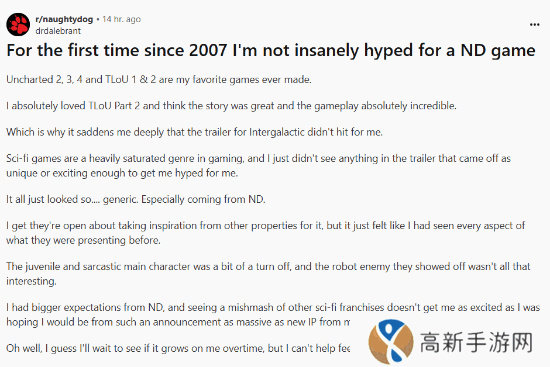 在TGA 2024颁奖典礼上,顽皮狗正式公布了旗下新作《星际:异端先知》,预告片也一并放出。今日,有玩家在Reddit论坛里发表了自己对《星际:异端先知》的看法,并表示自己自2007年以来第一次不对顽皮狗的游戏抱有期待。