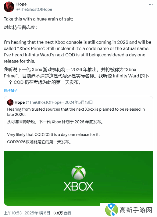 今日,@TheGhostOfHope再次发文重申了这一点,并表示新一代Xbox主机可能会被命名为“Xbox Prime”,但目前还不清楚这是代号还是正式名称。除此之外,IW组的下一款《使命召唤》游戏仍被考虑作为该主机的首发游戏,且Xbox掌机将在这款主机之后发布。