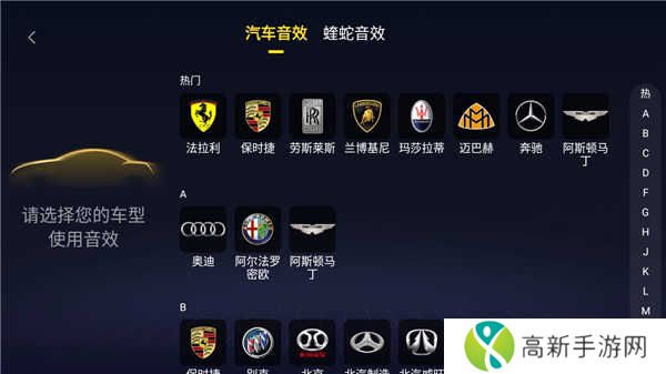 2、进入音效设页面,选择你的车型,可以根据你的车型使用音效