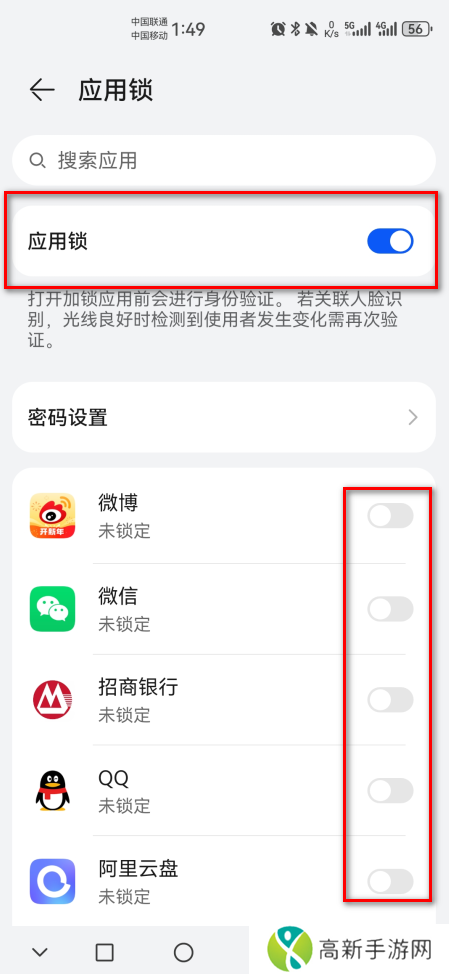 5、如以下的界面,应用锁已经开启,对应的软件密码锁我们可以点击右边的按钮进行开启。