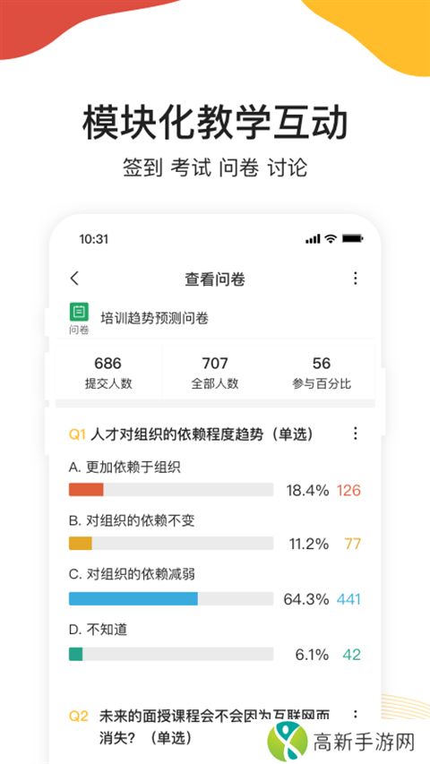 1.强大的课程管理系统。问卷模板的自由组合、互动活动的实时控制和日历视图使课程安排井然有序。